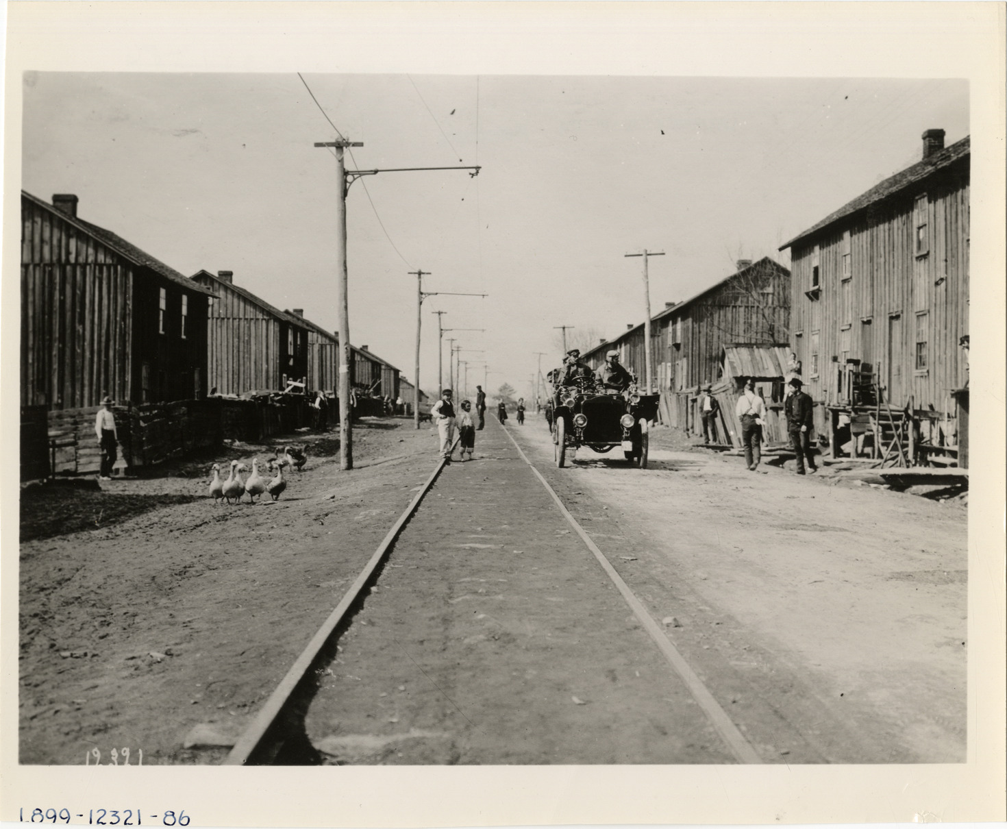 View of motorists driving car through coal mining district during the 1905 Glidden Tour. Road is lined with board and batten houses; children stand on railroad tracks; flock of ducks on left. Handwritten on back: "Automobile, 1906, 1st volume, story on coal mining district. Tours--Glidden Tour, 1905."