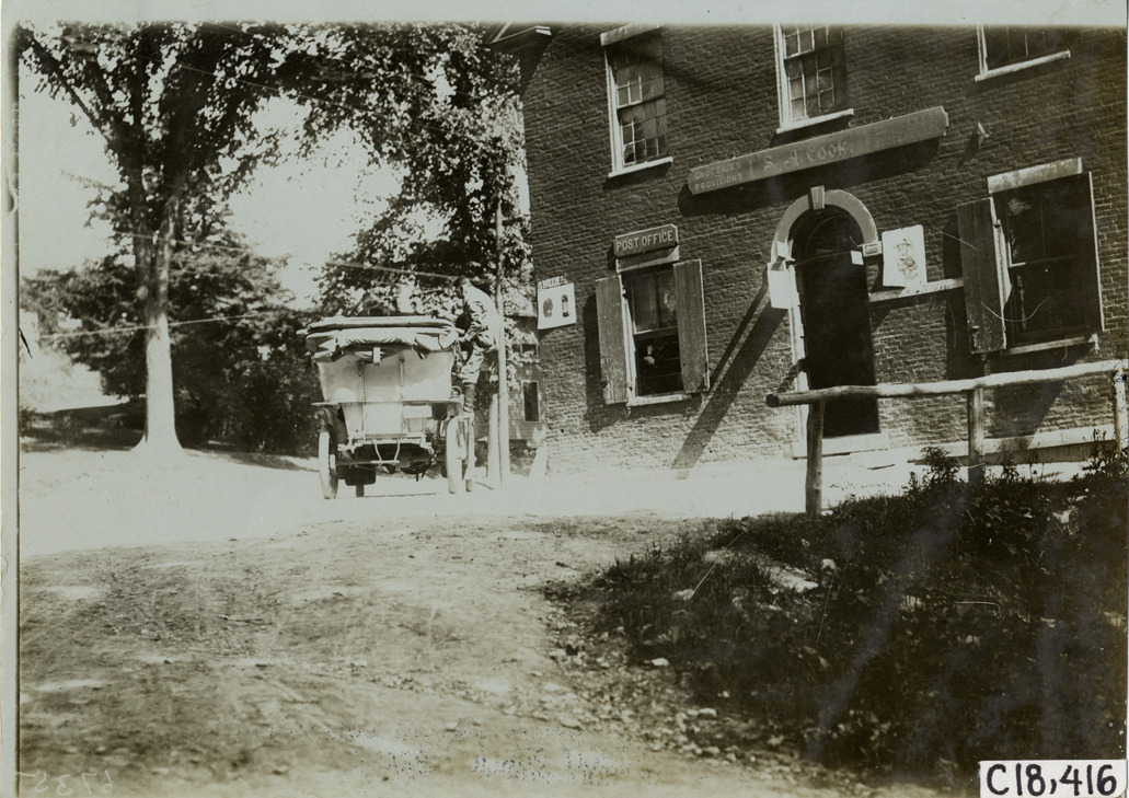 Automobile parked in front of post office and S.A. Cook grocery store, 1905 Glidden Tour