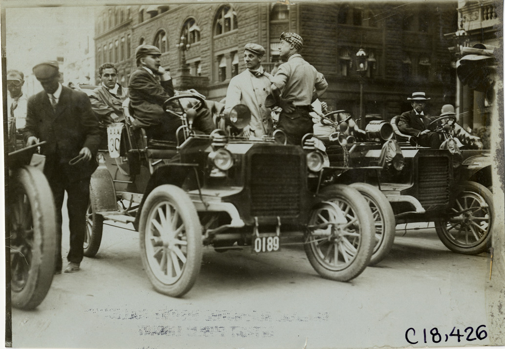 View of R.E. Olds in Reo car no. 30 speaking with other motorists during the 1905 Glidden Tour. Stone building in background. Stamped on back: "Photo by F. Ed. Spooner, 1536 B'way, telephone 6536-38th St., New York, N.Y." Handwritten on back: "#30, 16 h.p. Reo, R.E. Olds. Tours--Glidden Tour, 1905."