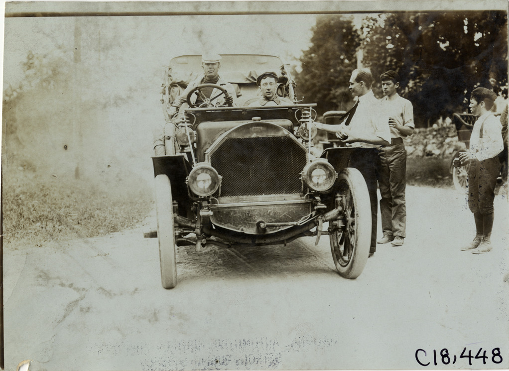 Front view of driver and passenger in car during the 1905 Glidden Tour. Man and two boys stand next to car. Stamped on back: "Photo by F. Ed. Spooner, 1536 B'way, telephone 6536-38th St., New York, N.Y." Handwritten on back: "Tours--Glidden Tour, 1905."