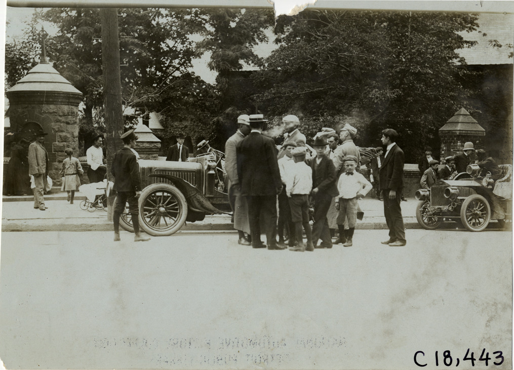 View of group of men and boys standing in road in front of parked cars during the 1905 Glidden Tour. Stamped on back: "Photo by F. Ed. Spooner, 1536 B'way, telephone 6536-38th St., New York, N.Y." Handwritten on back: "Tours--Glidden Tour, 1905."