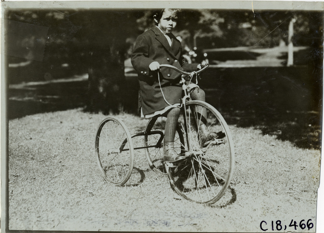 Daughter of Ezra H. Fitch riding tricycle, 1905 Glidden Tour