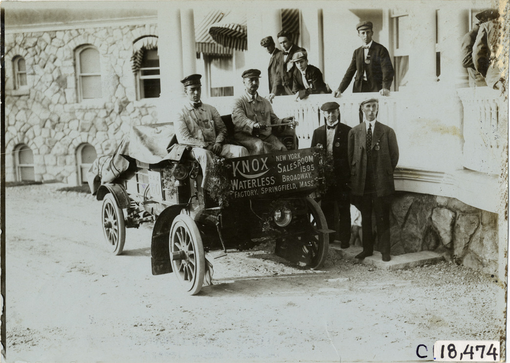 View of driver and passenger in Knox truck during the 1905 Glidden Tour. Sign in front of truck reads: "Knox waterless, New York salesroom, 1595 Broadway, factory, Springfield, Mass." Spectators in background. Stamped on back: "Photo by F. Ed. Spooner, 1536 B'way, telephone 6536-38th St., New York, N.Y." Handwritten on back: "#60 Knox baggage wagon. Tours--Glidden Tour, 1905."
