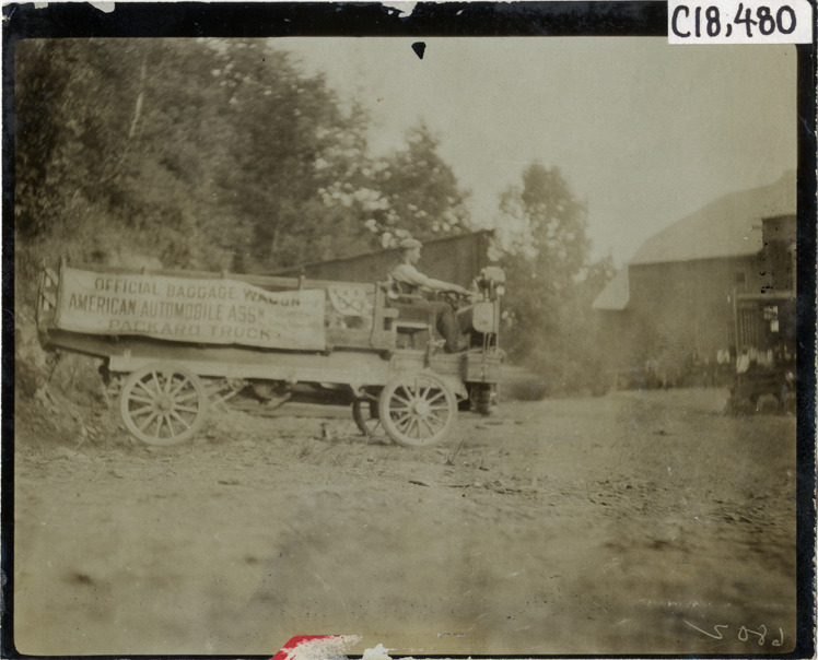 View of driver in Packard baggage wagon during the 1905 Glidden Tour. Banner displayed on side of truck reads: "Official baggage wagon, American Automobile Assn., Packard truck." Stamped on back: "Photo by F. Ed. Spooner, 1536 B'way, telephone 6536-38th St., New York, N.Y." Handwritten on back: "Tours--Glidden Tour, 1905."