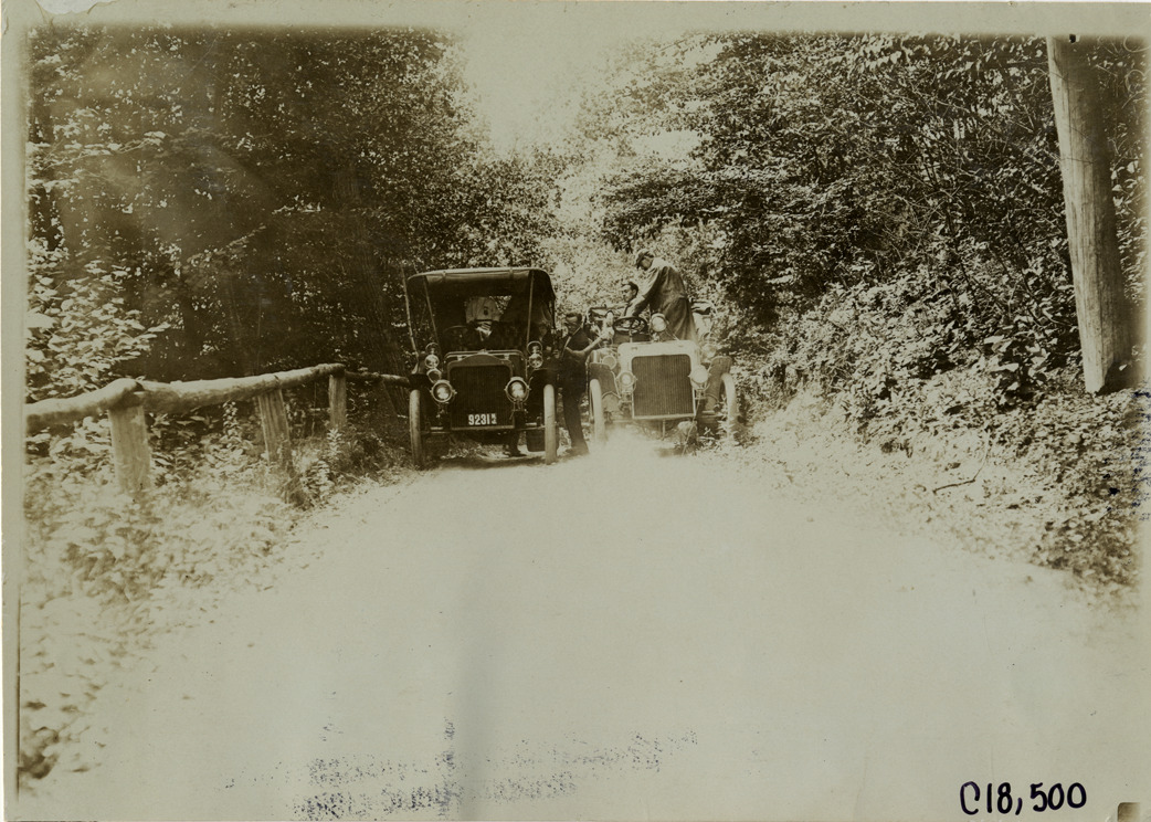 Favorite this☆ Automobiles stopping on road, 1905 Glidden Tour Description: View of two cars parked side by side on road in woods during the 1905 Glidden Tour. Stamped on back: "Photo by F. Ed. Spooner, 1536 B'way, telephone 6536-38th St., New York, N.Y." Handwritten on back: "Tours--Glidden Tour, 1905." Details Resource ID: na021068 Creator: Spooner, F. Ed. Subject: Automobiles Glidden Tour (1905) Automobile driving--Competitions--United States Photographers--New York (State)--New York Photographic prints Date Issued: 1905 Format: 1 photographic print ; 5 x 7 in. Member of: National Automotive History Collection Lazarnick Collection Filing Location: Tours--Glidden Tour, 1905 #9 Negative Number: Negative #C18,500 Rights: Physical rights are retained by DPL. Copyright is retained in accordance with U.S. copyright laws.