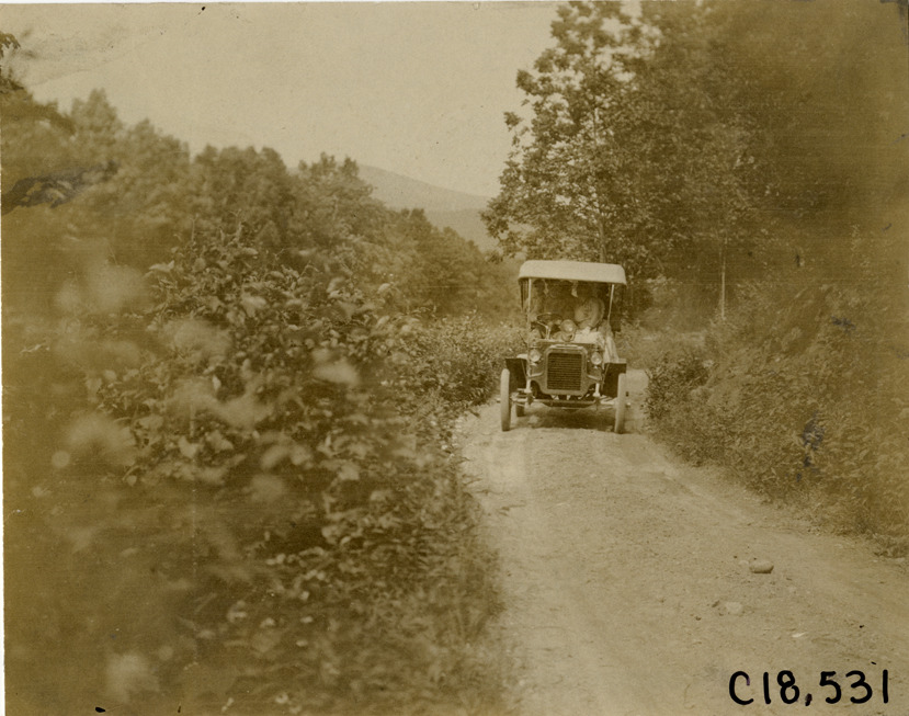 Motorists in automobile on rural road, 1905 Glidden Tour