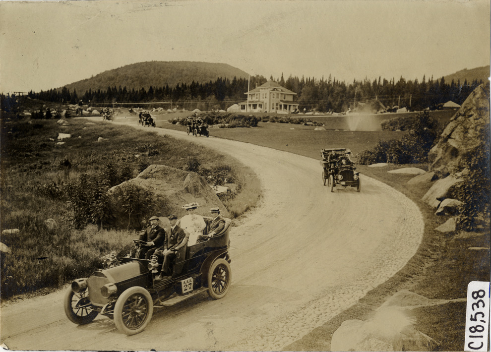 View of cars traveling on road during the 1905 Glidden Tour. House in background. Stamped on back: "N. Lazarnick, 29 West 42nd Street, New York." Handwritten on back: "Tours--Glidden Tour, 1905."