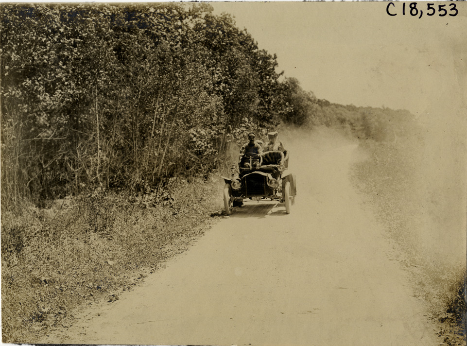 View of driver and passengers in car traveling on rural dirt road during the 1905 Glidden Tour. Stamped on back: "N. Lazarnick, 29 West 42nd Street, New York." Handwritten on back: "Tours--Glidden Tour, 1905."