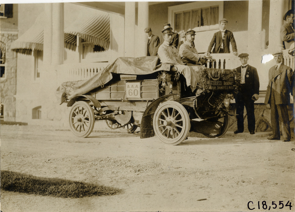 View of driver and passenger in Knox truck during the 1905 Glidden Tour. Sign in front of truck reads: "Knox waterless, New York salesroom, 1595 Broadway, factory, Springfield, Mass." Spectators in background. Stamped on back: "N. Lazarnick, 29 West 42nd Street, New York." Handwritten on back: "Tours--Glidden Tour, 1905."