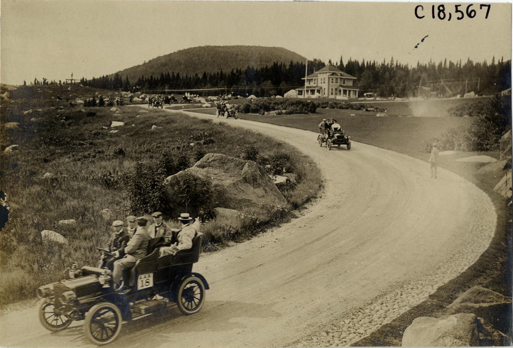 View of cars traveling on road during the 1905 Glidden Tour. House in background. Stamped on back: "N. Lazarnick, 29 West 42nd Street, New York." Handwritten on back: "Tours--Glidden Tour, 1905."