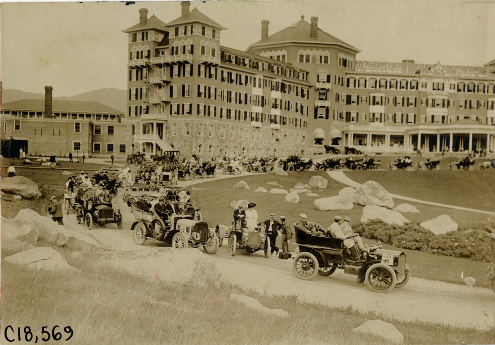 Automobiles lined up in front of Mount Washington Hotel, 1905 Glidden Tour