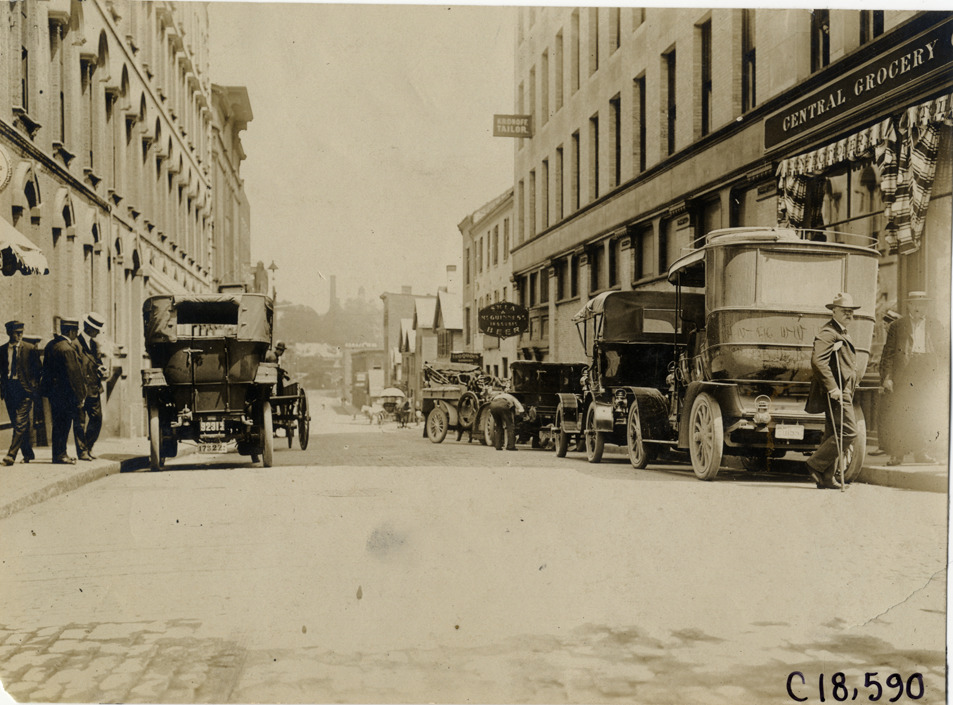 Rear view of cars parked in street during the 1905 Glidden Tour. Man with crutches stands on right; sign for Central Grocery on building. Stamped on back: "N. Lazarnick, 29 West 42nd Street, New York." Handwritten on back: "Tours--Glidden Tour, 1905."