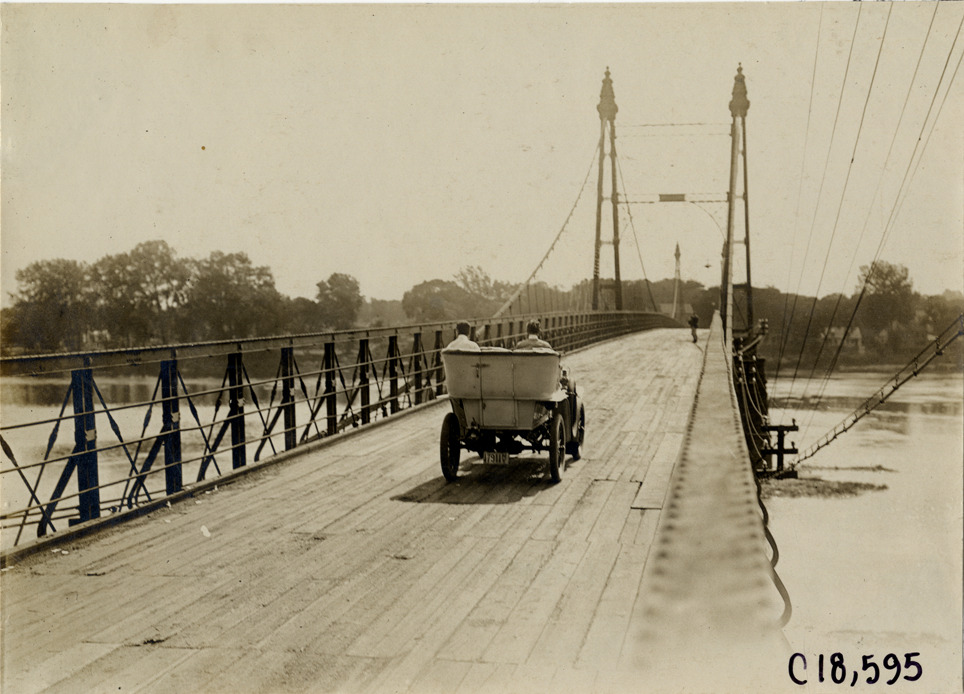 Motorists in automobile crossing bridge, 1905 Glidden Tour