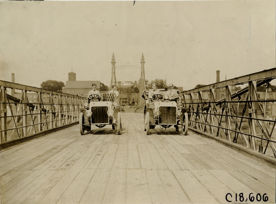 Favorite this☆ Automobiles crossing bridge, 1905 Glidden Tour Description: Front view of two cars crossing bridge during the 1905 Glidden Tour. Stamped on back: "N. Lazarnick, 29 West 42nd Street, New York." Handwritten on back: "Tours--Glidden Tour, 1905." Details Resource ID: na021161 Creator: Lazarnick, Nathan Subject: Automobiles Bridges Glidden Tour (1905) Automobile driving--Competitions--United States Photographers--New York (State)--New York Photographic prints Date Issued: 1905 Format: 1 photographic print ; 4.75 x 6.5 in. Member of: National Automotive History Collection Lazarnick Collection Filing Location: Tours--Glidden Tour, 1905 #13 Negative Number: Negative #C18,606 Rights: Physical rights are retained by DPL. Copyright is retained in accordance with U.S. copyright laws.