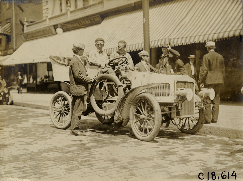 View of man speaking with driver and passenger in car during the 1905 Glidden Tour. Commercial buildings in background. Stamped on back: "N. Lazarnick, 29 West 42nd Street, New York." Handwritten on back: "Tours--Glidden Tour, 1905."