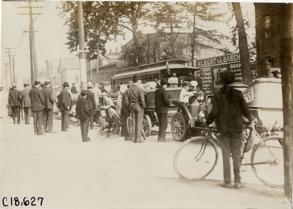 Spectators standing on sidewalk, 1906 Glidden Tour