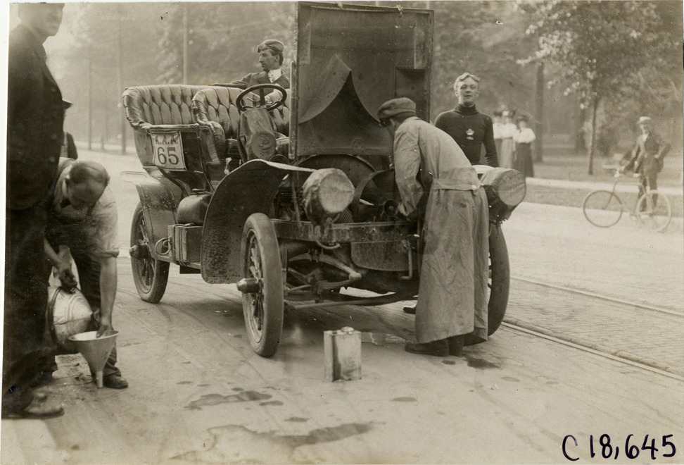 View of Thomas E. Schultz working under hood of Marmon car during the 1906 Glidden Tour. Man pours liquid into funnel on left. Handwritten on back: "#65, 30 h.p. Marmon, Thomas E. Schultz. Tours--Glidden Tour, 1906."