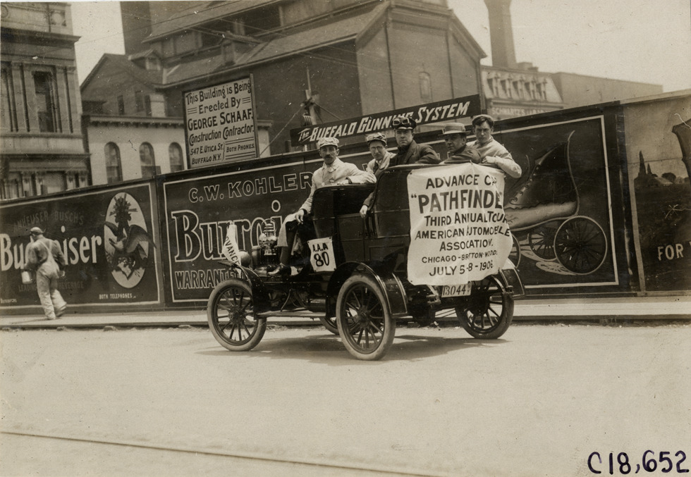 View of motorists posing with official Maxwell pathfinder car during the 1906 Glidden Tour. Banner on car reads: "Advance car, pathfinder, Third Annual American Automobile Association, Chicago-Bretton Woods, July 5-28, 1906." Billboards in background. Handwritten on back: "#80, 16 h.p. Maxwell official car. Tours--Glidden Tour, 1906."