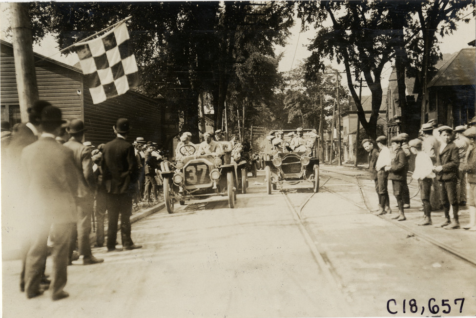 Favorite this☆ Motorists in automobiles, 1906 Glidden Tour Description: View of motorists in two cars during the 1906 Glidden Tour. Spectators stand on sidewalks; checkered flag in foreground. Handwritten on back: "Tours--Glidden Tour, 1906." Details Resource ID: na021219 Subject: Automobiles Glidden Tour (1906) Automobile driving--Competitions Photographic prints Date Issued: 1906-07 Format: 1 photographic print ; 4.5 x 6.5 in. Member of: National Automotive History Collection Lazarnick Collection Filing Location: Tours--Glidden Tour, 1906 #2 Negative Number: Negative #C18,657 Rights: Physical rights are retained by DPL. Copyright is retained in accordance with U.S. copyright laws.