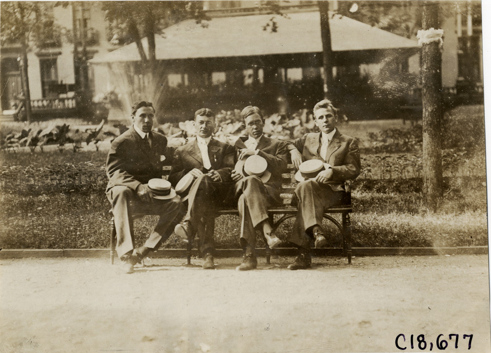 Favorite this☆ Men posing on park bench, 1906 Glidden Tour Description: View of four men, holding straw boaters, posing on a park bench during the 1906 Glidden Tour. Handwritten on back: "Tours--Glidden Tour, 1906." Details Resource ID: na021238 Subject: Portraits, Group Benches Glidden Tour (1906) Automobile driving--Competitions Photographic prints Date Issued: 1906-07 Format: 1 photographic print ; 4.75 x 6.5 in. Member of: National Automotive History Collection Lazarnick Collection Filing Location: Tours--Glidden Tour, 1906 #3 Negative Number: Negative #C18,677 Rights: Physical rights are retained by DPL. Copyright is retained in accordance with U.S. copyright laws.