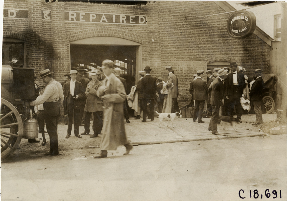 Motorists and spectators in front of Hodges Garage, 1906 Glidden Tour