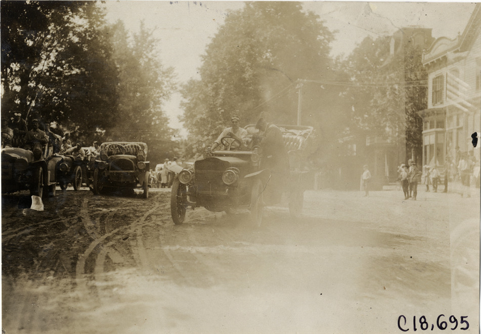 View of driver and passenger in car during the 1906 Glidden Tour. Spectators and houses on right; other cars in background. Handwritten on back: "Tours--Glidden Tour, 1906."