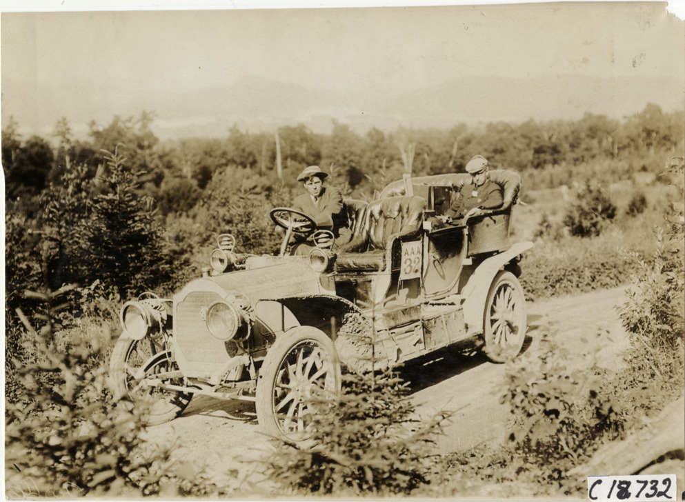 View of Ben W. Richert and passenger in Packard car no. 32 during the 1906 Glidden Tour. Handwritten on back: "#32, 24 h.p. Packard, Ben W. Richart [sic]. Tours--Glidden Tour, 1906."