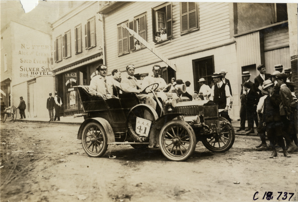 View of I.C. Kirkham and passengers in Maxwell car no. 41 during the 1906 Glidden Tour. Spectators and commercial buildings in background. Stamped on back: "F. Ed. Spooner, and Chas. S. Wells. Motor News, Motor Photos, Motor Adv, 1536 B'way, New York. Tel 6536-38th St." Handwritten on back: "#41, 16 h.p. Maxwell, I.C. Kirkham. Tours--Glidden Tour, 1906."