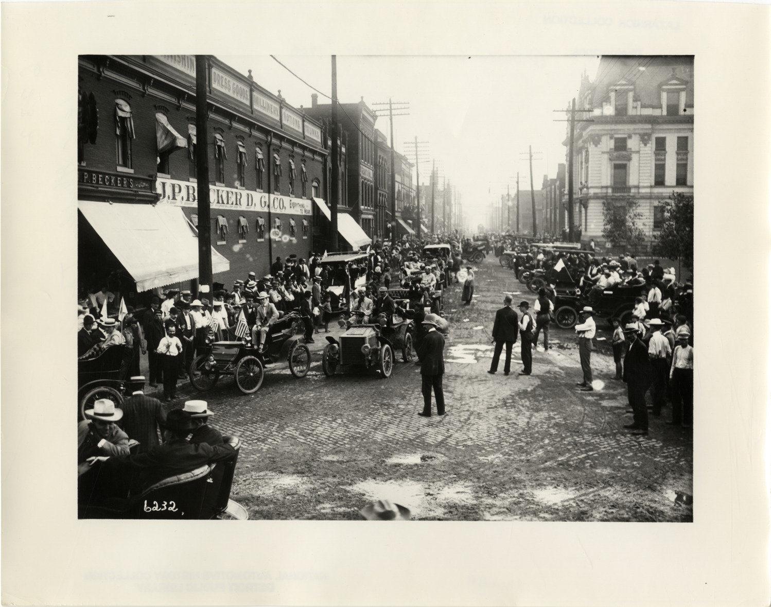 View of motorists in cars parked in street lined with commercial buildings during the 1906 Glidden Tour. Handwritten on back: "Tours--Glidden Tour, 1906."