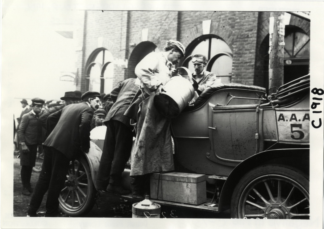 View of J.H. McDuffee standing next to Stoddard-Dayton car with bucket during the 1906 Glidden Tour. Two men lean over hood of car. Handwritten on back: "#5 Stoddard-Dayton, 30-35 h.p., J.H. McDuffee. Tours--Glidden Tour, 1906."