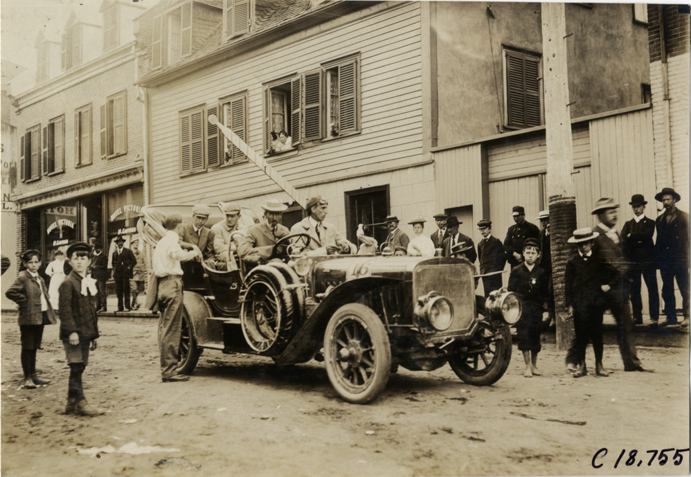 View of Robert B. Crawford and passengers in Stevens-Duryea car no. 16 during the 1906 Glidden Tour. Spectators and commercial buildings in background. Stamped on back: "F. Ed. Spooner, and Chas. S. Wells. Motor News, Motor Photos, Motor Adv, 1536 B'way, New York. Tel 6536-38th St." Handwritten on back: "#16, 50 h.p. Stevens Duryea, Robert B. Crawford. Tours--Glidden Tour, 1906."