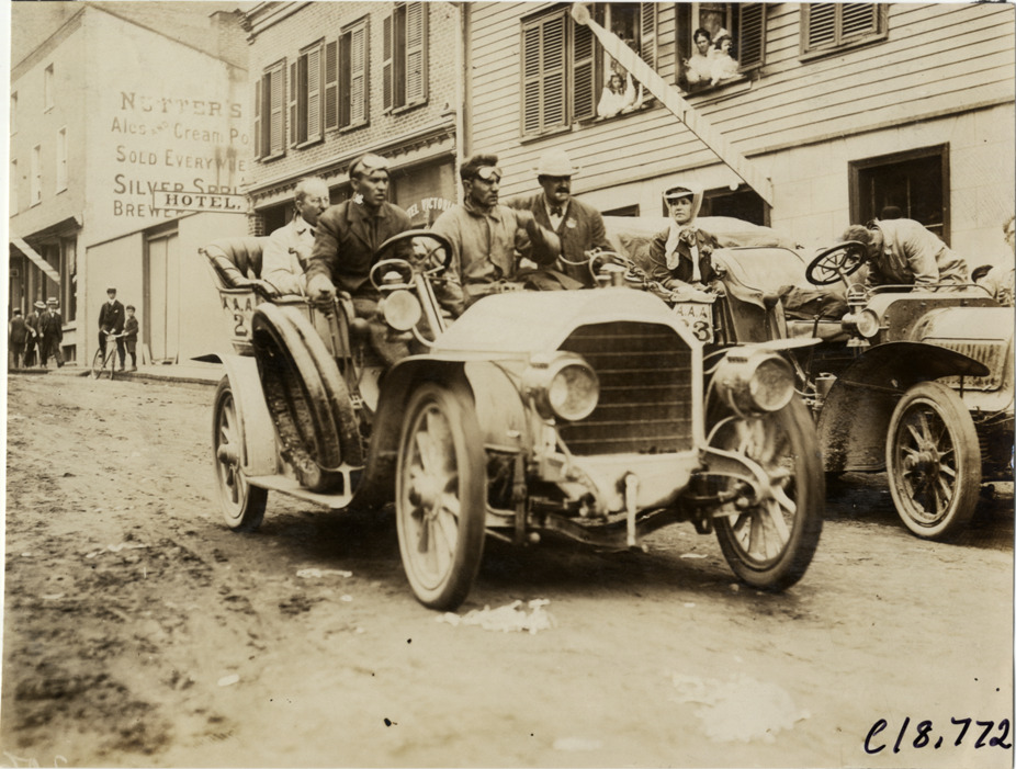 View of Arthur Holden and passengers in Stearns car no. 2 during the 1906 Glidden Tour. Commercial buildings in background. Stamped on back: "F. Ed. Spooner, and Chas. S. Wells. Motor News, Motor Photos, Motor Adv, 1536 B'way, New York. Tel 6536-38th St." Handwritten on back: "#2, 40-45 h.p. Stearns, Arthur Holden. Tours--Glidden Tour, 1906."