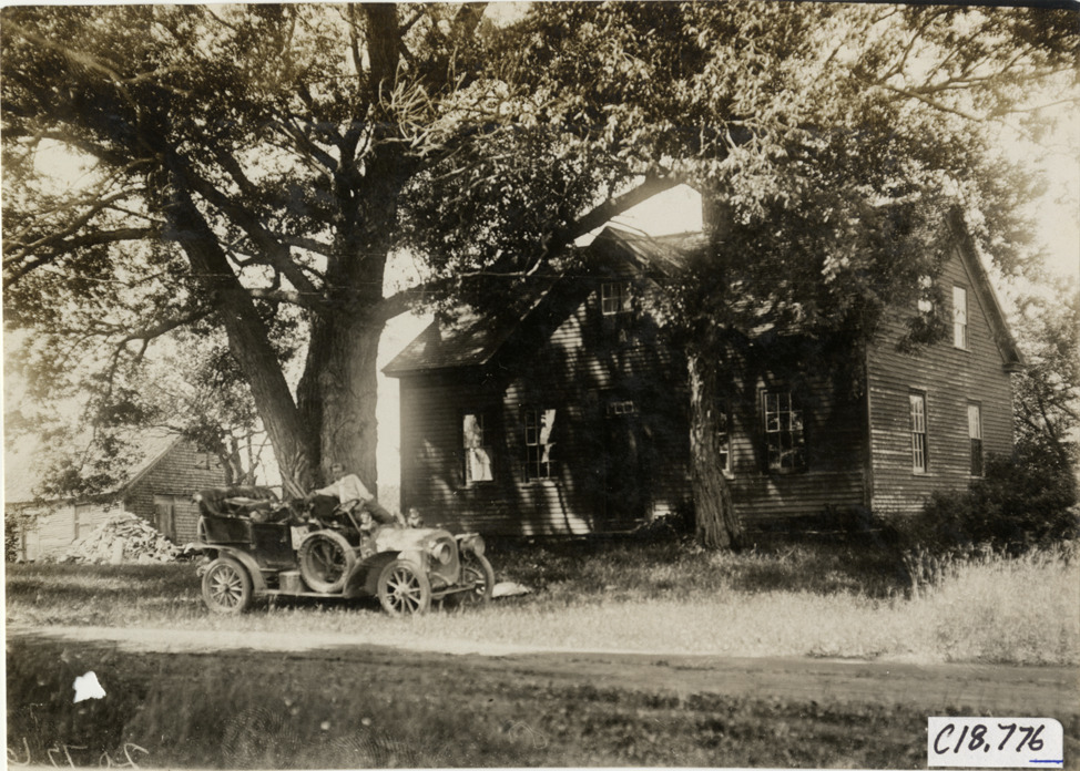 View of man posing in car parked in front of wooden-frame house during the 1906 Glidden Tour. Stamped on back: "F. Ed. Spooner, and Chas. S. Wells. Motor News, Motor Photos, Motor Adv, 1536 B'way, New York. Tel 6536-38th St." Handwritten on back: "Tours--Glidden Tour, 1906."