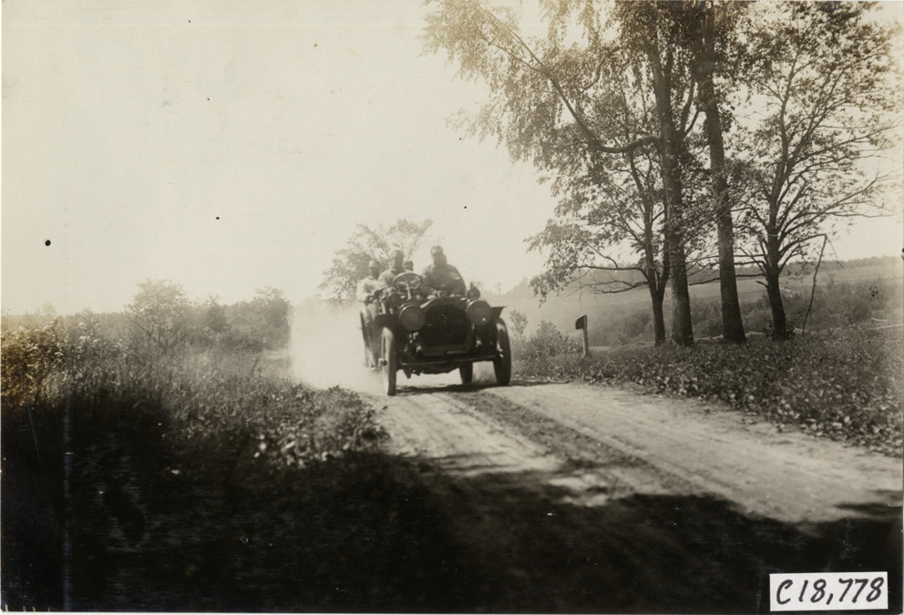 View of driver and passengers in car traveling on rural road during the 1906 Glidden Tour. Stamped on back: "F. Ed. Spooner, and Chas. S. Wells. Motor News, Motor Photos, Motor Adv, 1536 B'way, New York. Tel 6536-38th St." Handwritten on back: "Tours--Glidden Tour, 1906."