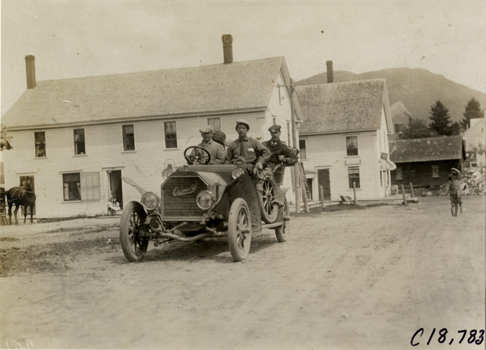 View of driver and passengers in Oldsmobile car during the 1906 Glidden Tour. Wooden-frame buildings in background. Stamped on back: "F. Ed. Spooner, and Chas. S. Wells. Motor News, Motor Photos, Motor Adv, 1536 B'way, New York. Tel 6536-38th St." Handwritten on back: "Tours--Glidden Tour, 1906."