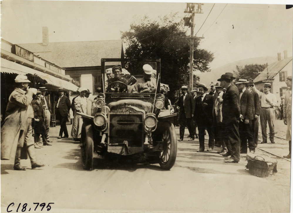 View of Ezra E. Kirk and passengers with Thomas car no. 8 on roadside during the 1906 Glidden Tour. Spectators stand nearby. Handwritten on back: "#8, 50 h.p. Thomas, Ezra E. Kirk. Tours--Glidden Tour, 1906."