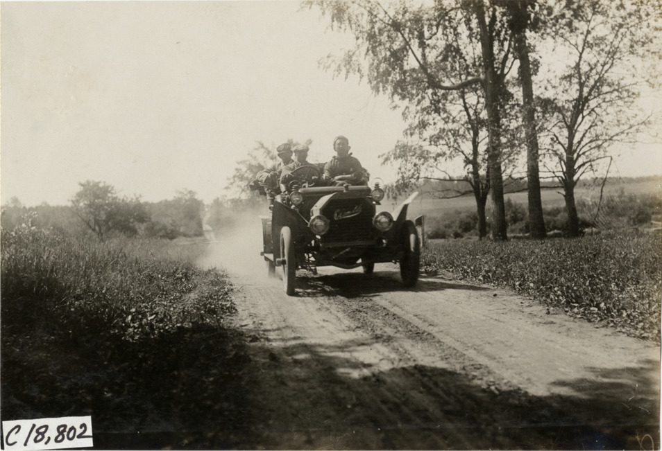 Motorists in Oldsmobile automobile traveling on rural road, 1906 Glidden Tour