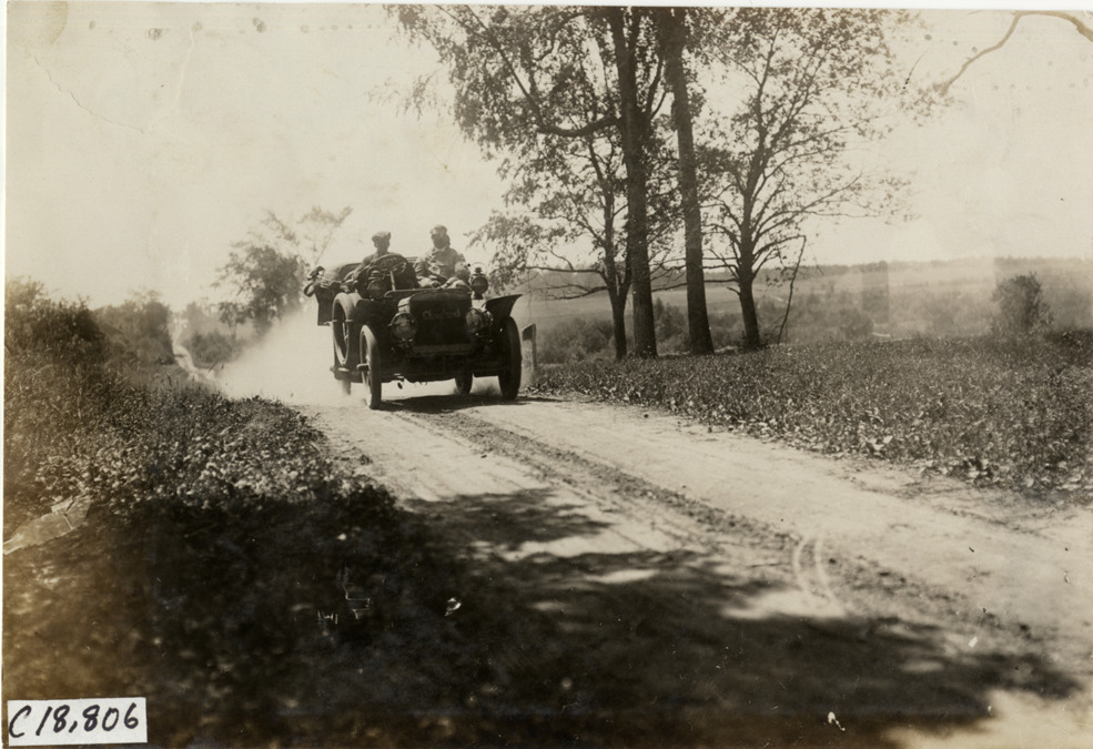 View of driver and passengers in Cleveland car traveling on rural road during the 1906 Glidden Tour. Stamped on back: "F. Ed. Spooner, and Chas. S. Wells. Motor News, Motor Photos, Motor Adv, 1536 B'way, New York. Tel 6536-38th St." Handwritten on back: "Tours--Glidden Tour, 1906."