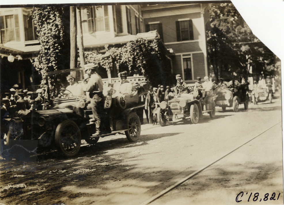 Favorite this☆ Motorists with automobiles lined up in street, 1906 Glidden Tour Description: View of motorists with cars lined up in street during the 1906 Glidden Tour. Houses in background. Handwritten on back: "Tours--Glidden Tour, 1906." Details Resource ID: na021391 Subject: Automobiles Streets Glidden Tour (1906) Automobile driving--Competitions Photographic prints Date Issued: 1906-07 Format: 1 photographic print ; 4.75 x 6.5 in. Member of: National Automotive History Collection Lazarnick Collection Filing Location: Tours--Glidden Tour, 1906 #8 Negative Number: Negative #C18,821 Rights: Physical rights are retained by DPL. Copyright is retained in accordance with U.S. copyright laws.