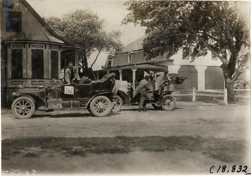 View of Ben W. Richert in Packard car no. 32 during the 1906 Glidden Tour. Second car and wooden-frame house and garage in background. Stamped on back: "F. Ed. Spooner, and Chas. S. Wells. Motor News, Motor Photos, Motor Adv, 1536 B'way, New York. Tel 6536-38th St." Handwritten on back: "#32, 24 h.p. Packard, Ben W. Richart [sic]. Tours--Glidden Tour, 1906."
