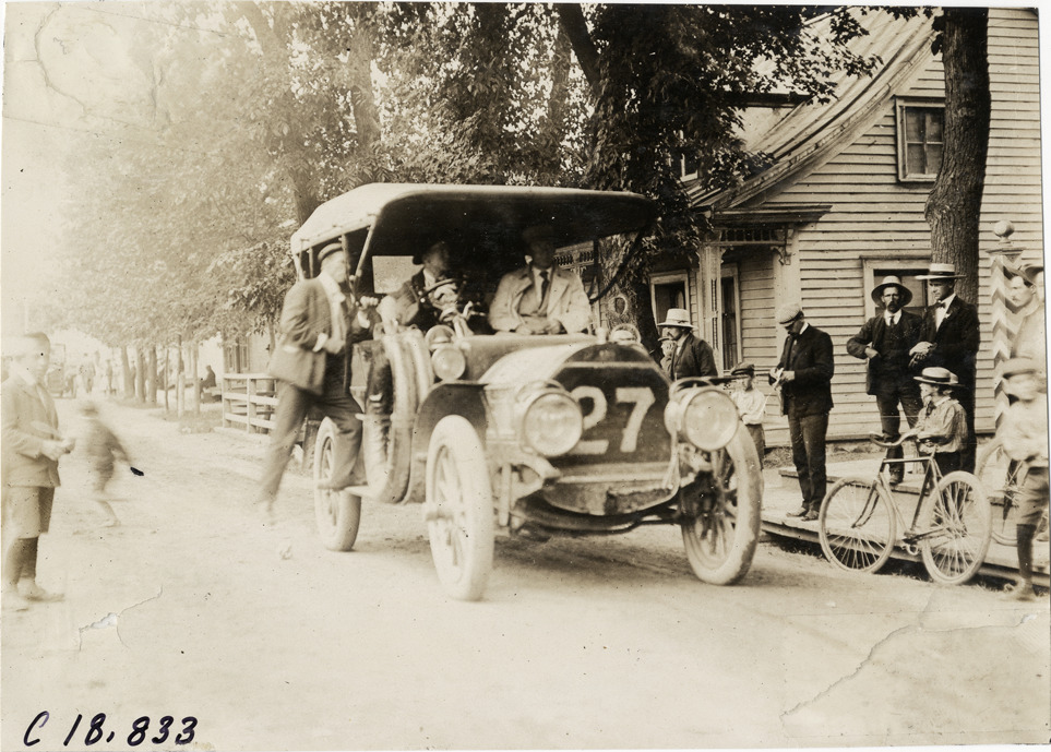 View of Percy Pierce and passengers in Pierce-Arrow car no. 27 during the 1906 Glidden Tour. Boy stands with bicycle at curb. Stamped on back: "F. Ed. Spooner, and Chas. S. Wells. Motor News, Motor Photos, Motor Adv, 1536 B'way, New York. Tel 6536-38th St." Handwritten on back: "#27, 40-45 h.p. Pierce, Percy P. Pierce. Tours--Glidden Tour, 1906."
