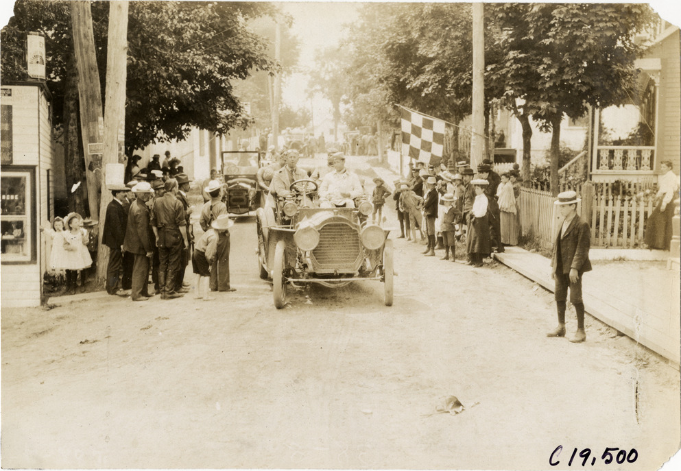 View of driver and passengers in car during the 1906 Glidden Tour. Spectators stand on both sides of street; checkered flag in background. Stamped on back: "Photo by N. Lazarnick, 29 West 42nd Street, New York." Handwritten on back: "Tours--Glidden Tour, 1906."