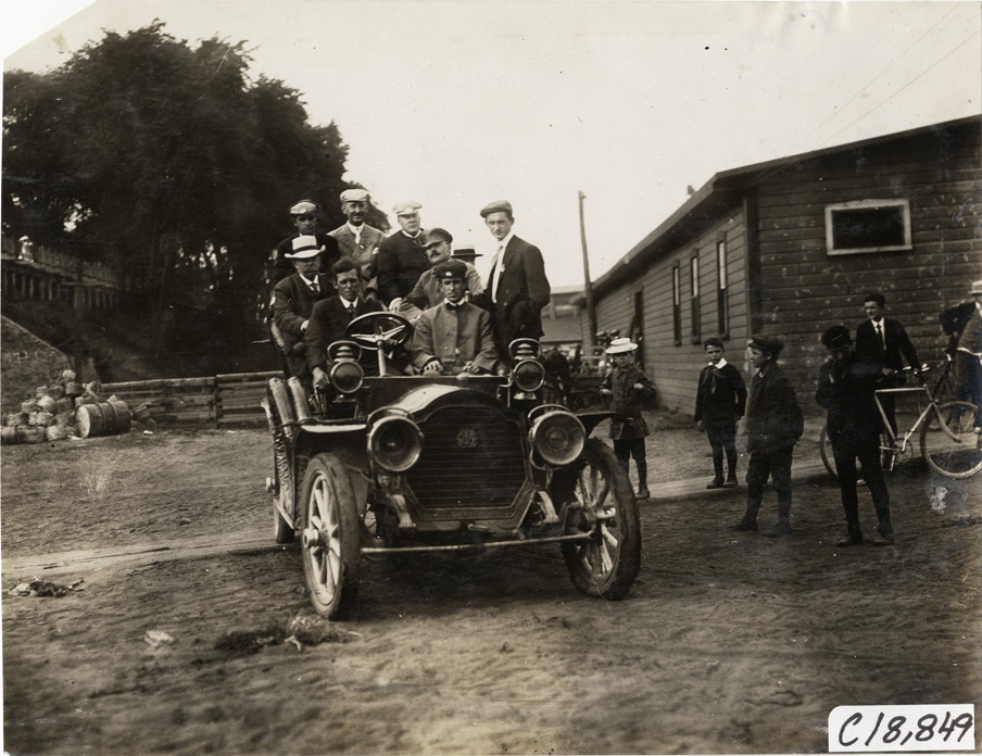 View of driver and passengers posing in car during the 1906 Glidden Tour. Wooden-frame building in background. Stamped on back: "F. Ed. Spooner, and Chas. S. Wells. Motor News, Motor Photos, Motor Adv, 1536 B'way, New York. Tel 6536-38th St." Handwritten on back: "Tours--Glidden Tour, 1906."