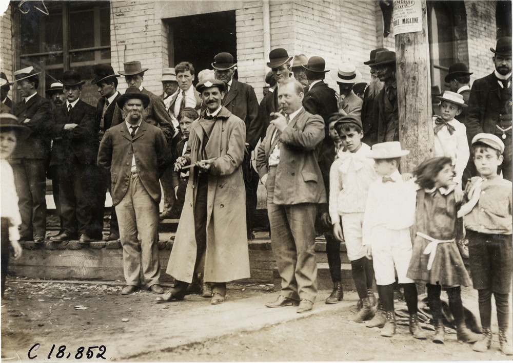 Close-up view of crowd standing on sidewalk during the 1906 Glidden Tour. Man wearing driving coat stands next to man smoking a pipe; group of children on right. Stamped on back: "F. Ed. Spooner, and Chas. S. Wells. Motor News, Motor Photos, Motor Adv, 1536 B'way, New York. Tel 6536-38th St." Handwritten on back: "Tours--Glidden Tour, 1906."
