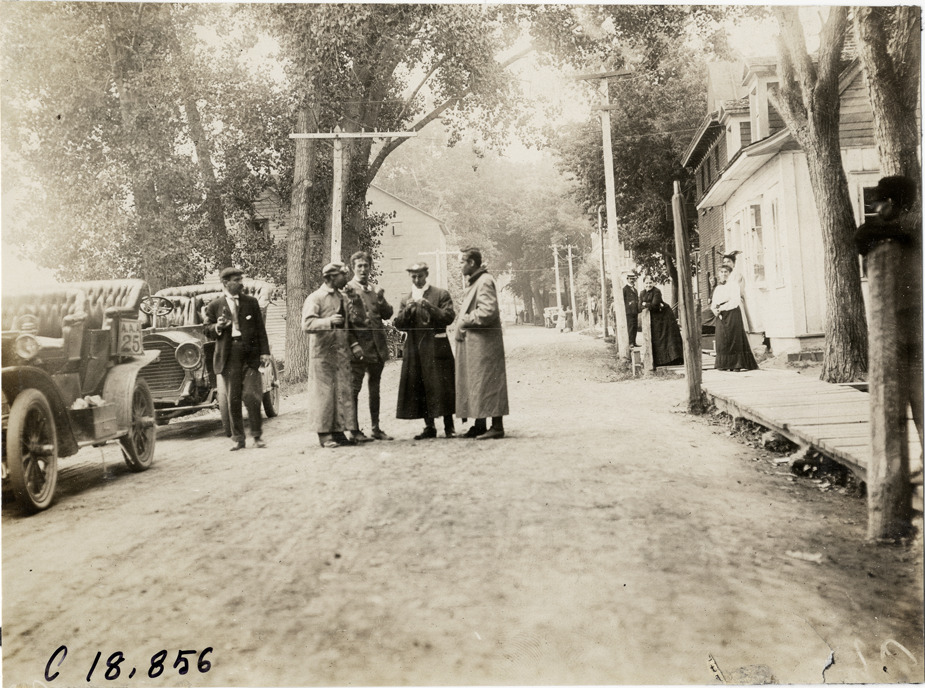 View of several men, wearing driving clothes, standing in middle of street during the 1906 Glidden Tour. Two cars parked on left. Stamped on back: "F. Ed. Spooner, and Chas. S. Wells. Motor News, Motor Photos, Motor Adv, 1536 B'way, New York. Tel 6536-38th St." Handwritten on back: "Tours--Glidden Tour, 1906."