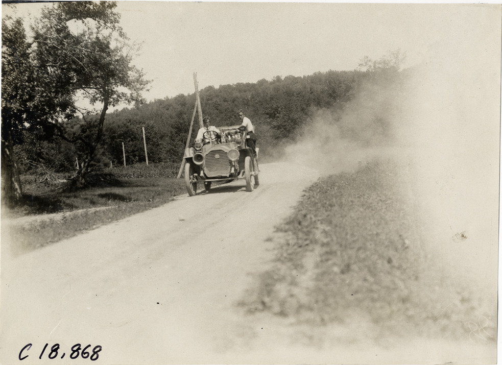 View of driver and passenger in car traveling on rural dirt road during the 1906 Glidden Tour. Stamped on back: "F. Ed. Spooner, and Chas. S. Wells. Motor News, Motor Photos, Motor Adv, 1536 B'way, New York. Tel 6536-38th St." Handwritten on back: "Tours--Glidden Tour, 1906."