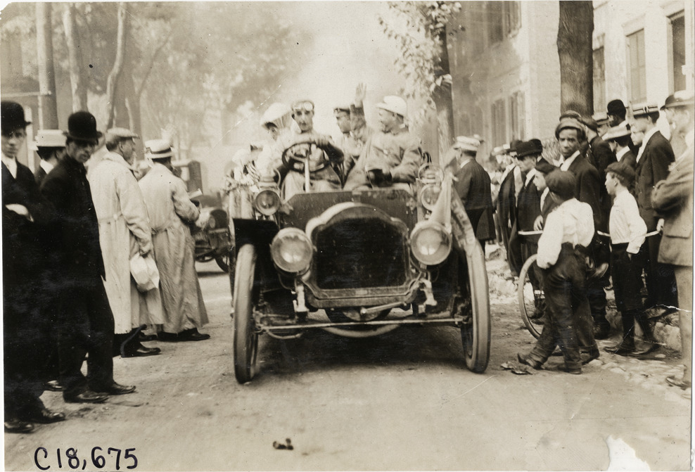 Front view of driver and passengers in car during the 1906 Glidden Tour. Spectators stand on both sides of street. Handwritten on back: "Tours--Glidden Tour, 1906."