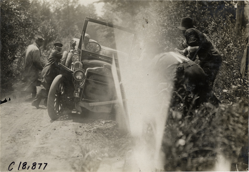 Ezra E. Kirk and motorists pushing Thomas automobile on roadside, 1906 Glidden Tour