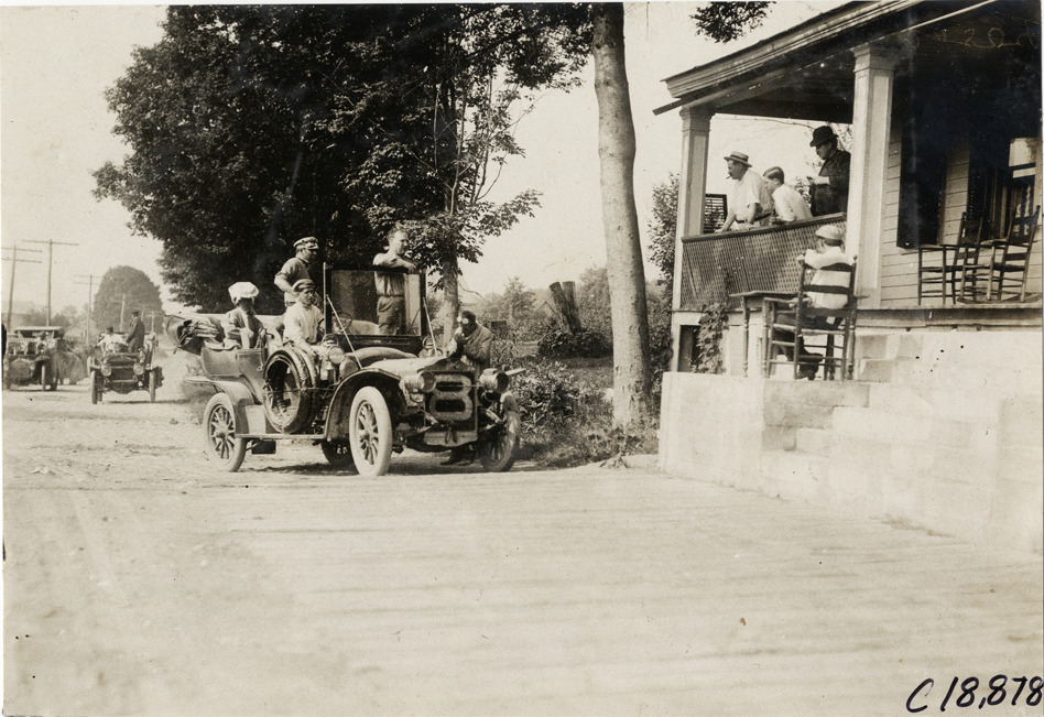 View of Ezra E. Kirk and motorists in Thomas car no. 8 speaking with spectators on porch of wooden-frame house during the 1906 Glidden Tour. Handwritten on back: "#8, 50 h.p. Thomas, Ezra E. Kirk. Tours--Glidden Tour, 1906."