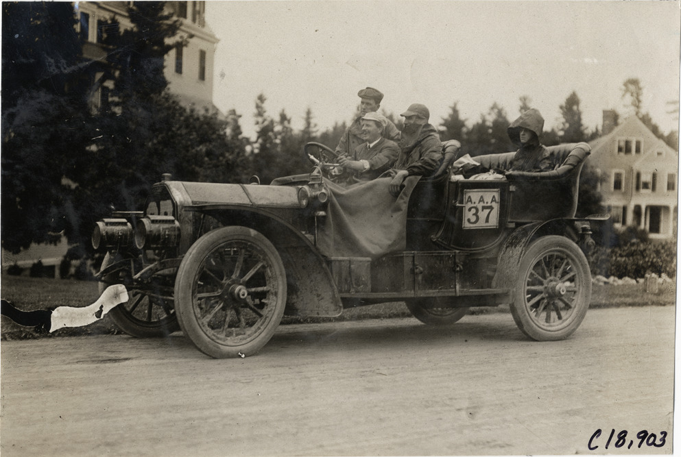 View of Charles Wridgway and passengers in Peerless car no. 37 during the 1906 Glidden Tour. Handwritten on back: "#37, 30 h.p. Peerless, Charles S. Wridgway. Tours--Glidden Tour, 1906."
